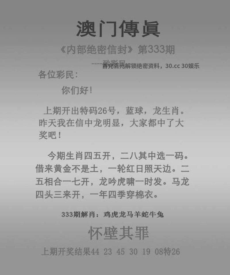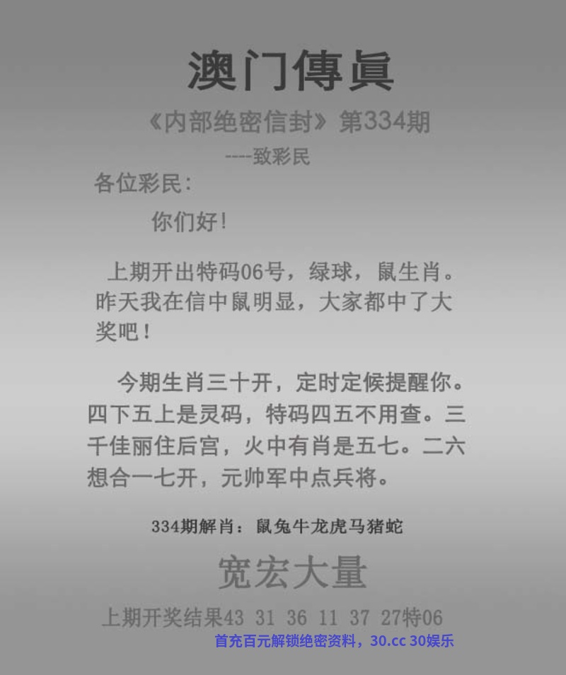 334期【马会传真】开猴46准 今期生肖三十开,定时定候提醒你 四下五上是灵码,特码四五不用查 三千佳丽住后宫,火中有肖是五七 二六想合一七开,元帅军中点兵将 解:今期四下五上是灵码,解四头特码40-49,火中有肖是五七,解火肖蛇马 综合:鸡蛇鼠兔牛羊虎猴狗 |