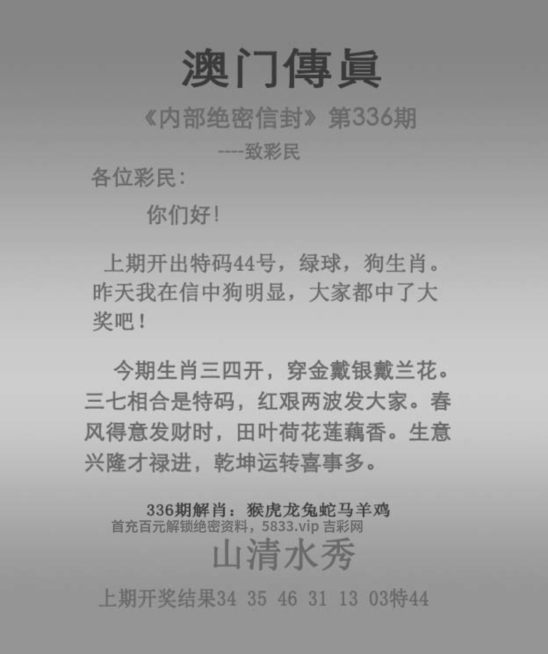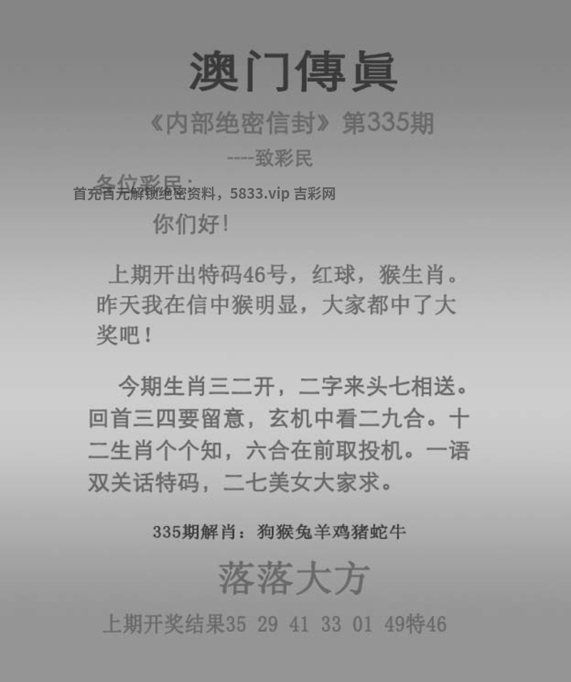 335期【马会传真】开狗44准 今期生肖三二开,二字来头七相送 回首三四要留意,玄机中看二九合 十二生肖个个知,六合在前取投机 一语双关话特码,二七美女大家求 解:今期生肖三二开,解大数特码25-49,一语双关话特码,解双肖虎鼠狗猴马龙 综合:兔鸡牛马猴狗猪虎蛇 |